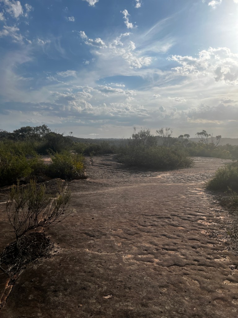 Roughly 100 metres down the fire trail (right) you will spot a small trail on the righthand side which after another 100 metres open out onto a flat rocky plane which seems like it never ends.