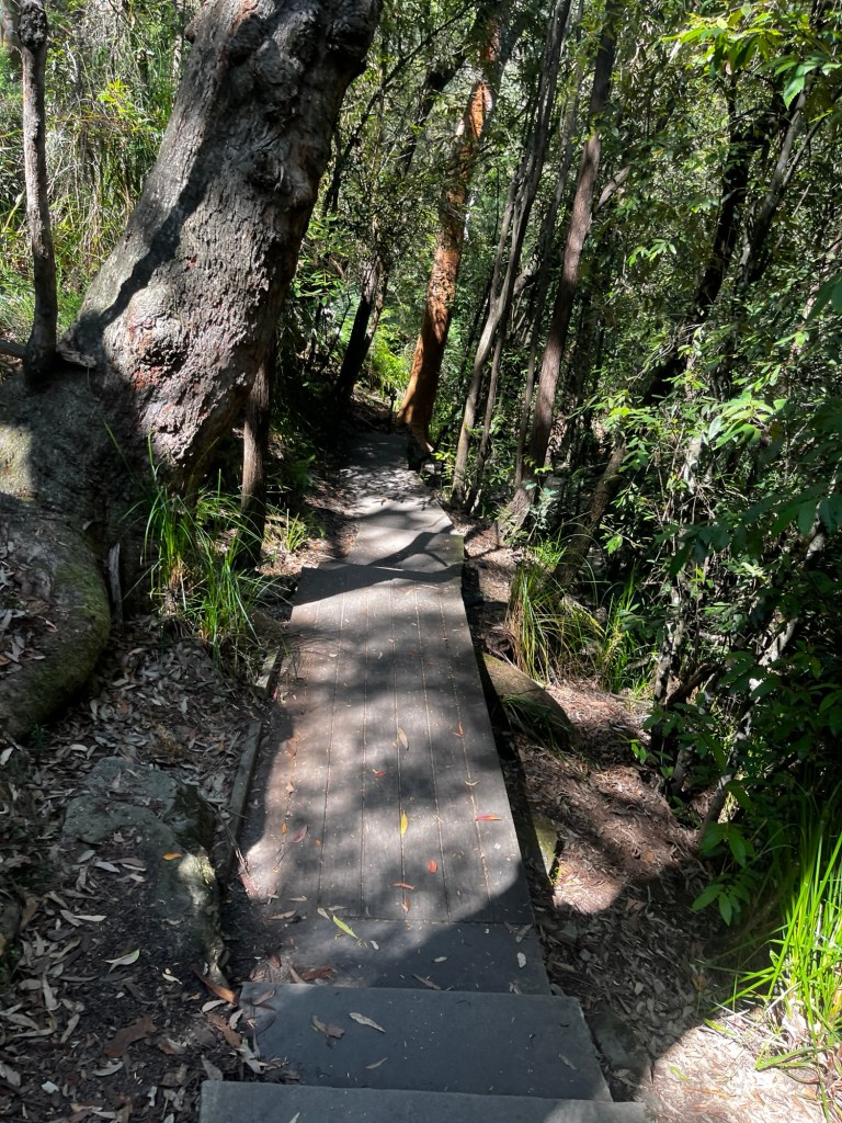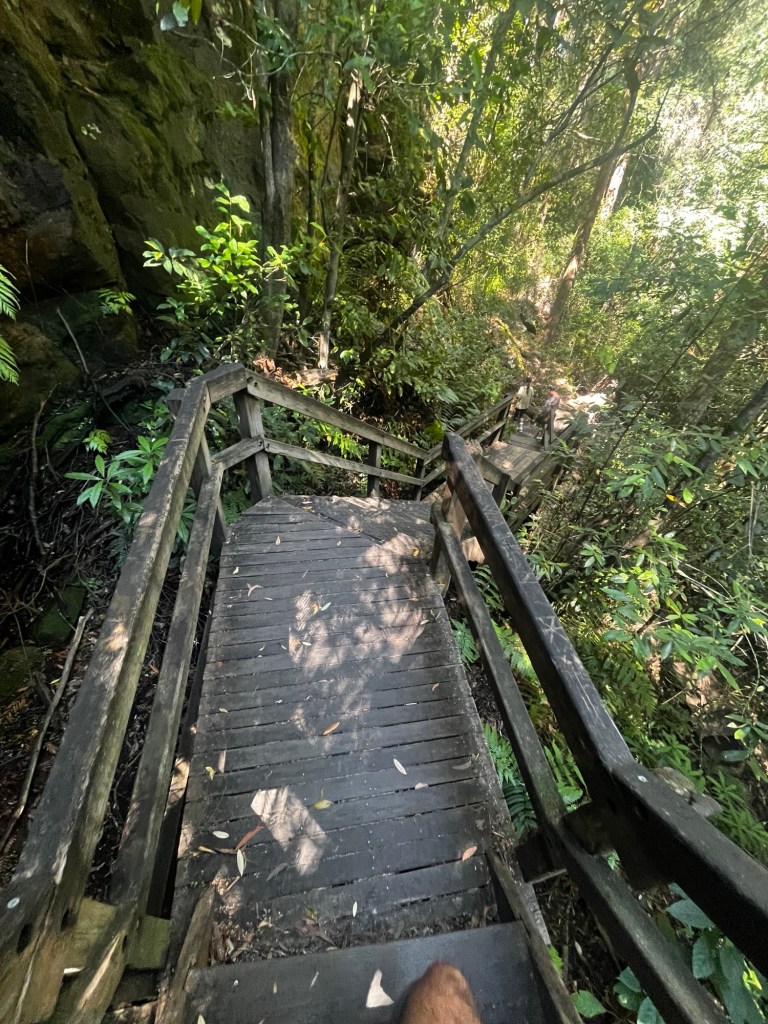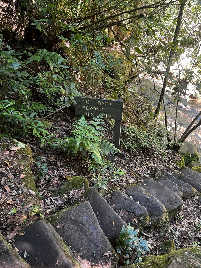 The walk to the bottom falls is 180 metres further on. If you continue back on the narrow dirt trail you will very soon reach another steep decline with a mixture of rock and wooden steps. when you reach the second to last set of stairs you will come across a sign that says ‘No Track Beyond This Point’ next to a stone staircase.